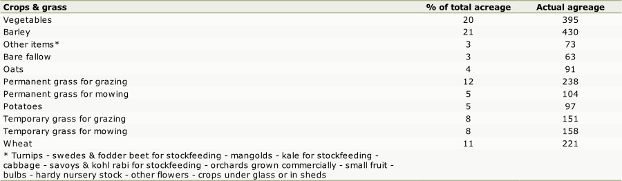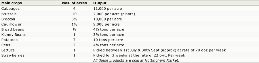 Woodborough’s agriculture is of two types, cereal and livestock farming, and market gardening. Out of a total of 2030 acres, 1,550 acres are under cereal and livestock farming and 450 acres under market gardening. In spite of the fact that ¾ of the acreage is under cereal and livestock farming there are only 15 holdings, as opposed to 21 which do market gardening. One can see from this that the cereal and livestock holdings are generally larger. This is because it is uneconomical to practise this type of farming on a small holding. Market gardening, on the other hand, can be very successful on holdings of only a few acres, as income per acre is very high. About half the total numbers of agricultural workers are employed in market gardening. This is due to the lack of mechanisation in market gardening compared with that in cereal and livestock farming.