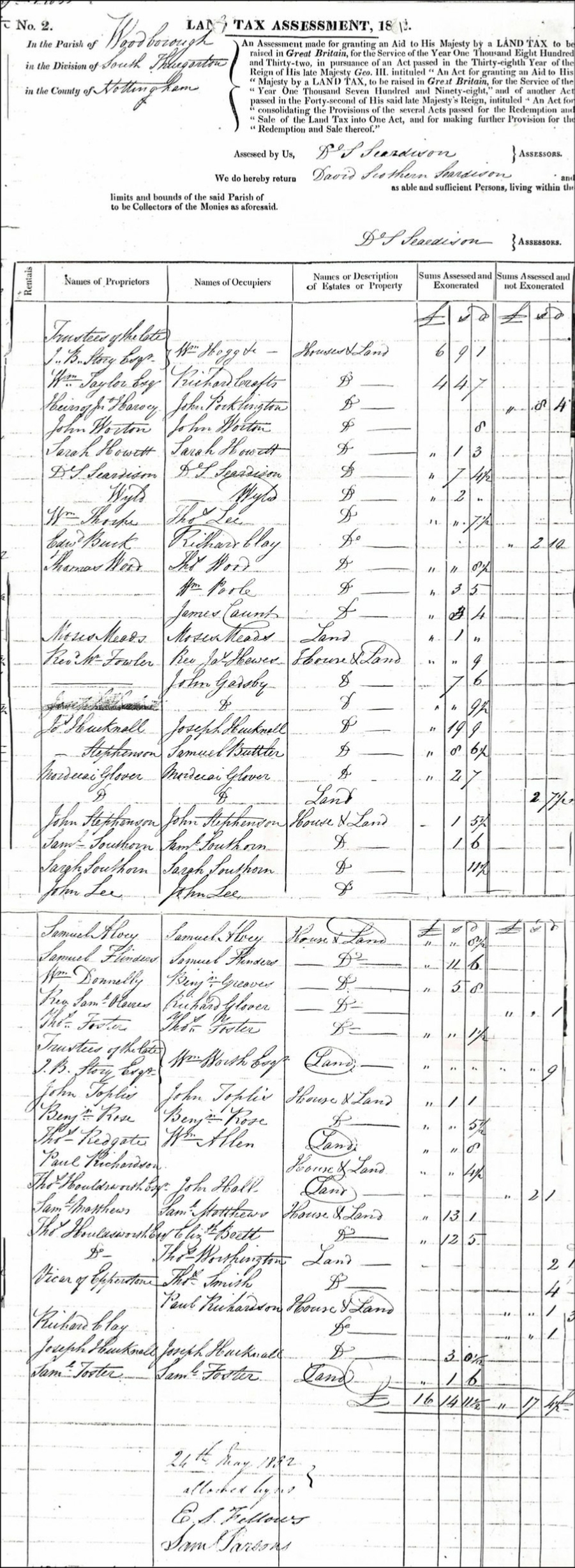 Below a typical completed Woodborough Land Tax Assessment form dated 24th May 1832