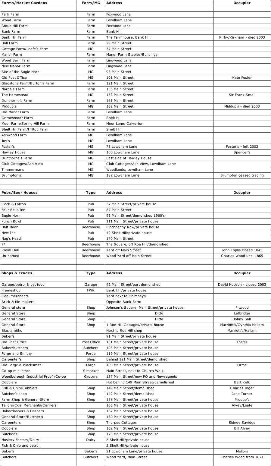 The following lists are taken from the Directories covering the period from around 1841 onwards. It is quite a comprehensive list, but there may be omissions.